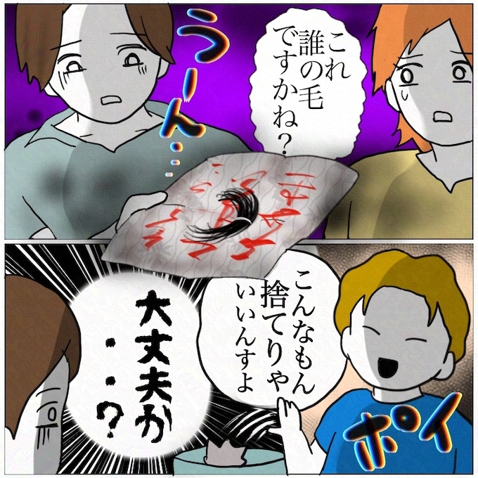 そんな中、新卒の後輩が誰も近づかなくなった和紙と毛束をひょいと手に取り、「こんなもん捨てりゃいいんすよ」と一言。そのままゴミ箱に捨ててしまったのです。怖いもの知らずにもほどがある行動に、近くにいた僕とスタッフはみんな驚愕。あいつ、呪われてなければいいけど⋯。