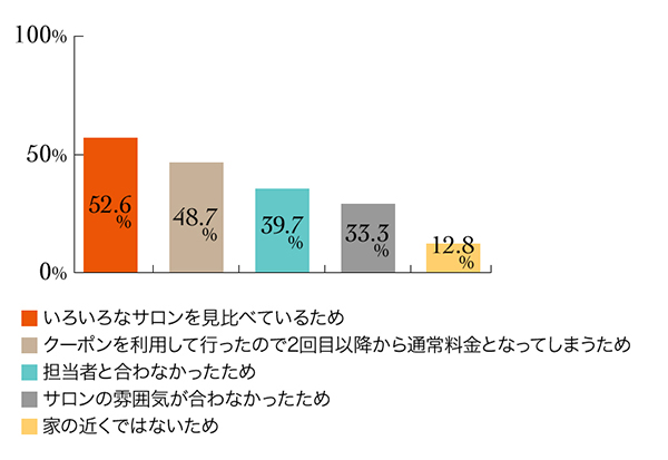 一番多かったのは「いろいろなサロンを見比べているため」という理由でした。次いで「クーポンを利用して行ったので2回目以降から通常料金となってしまうため」。「担当者と合わなかったため」や「サロンの雰囲気が合わなかったため」という意見は、サロン側としては、可能な限り減らしていきたい声ですね。