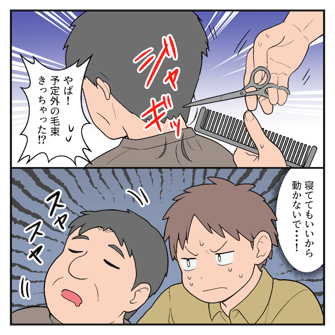 その後もお客さまは夢の中で左右にスイング。まるで振り子のようにゆらゆら揺れながら眠り続けます。僕はカットラインを合わせるのに必死で、冷や汗はダラダラ、頭の中は「寝てもいいから動かないでくれ」と思っていました。