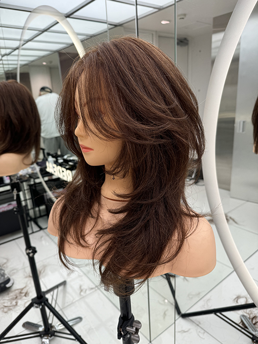 毛量と長さがあるので、レイヤーの入れ方による差が明確に出るのがポイント。丸みや柔らかさを強調する韓国風レイヤー、奥行き感と動きを入れたいワンホンレイヤーも自由自在。「ロングを切れる」ウィッグは実は貴重。ウエイトコントロール・スタイリングまで一通り練習できますよ。
