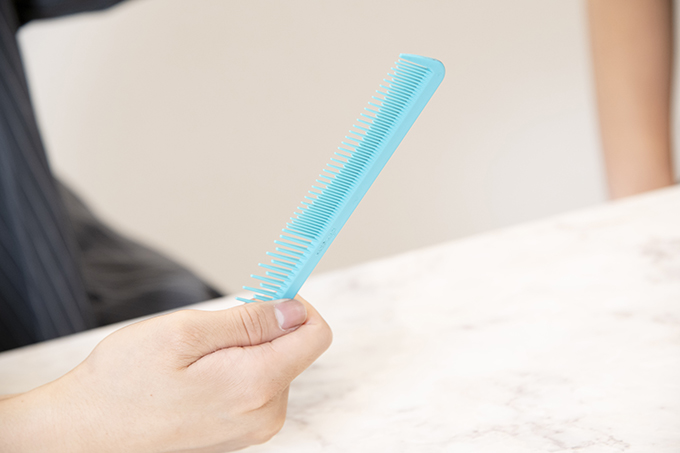 密歯と粗歯が絶妙に組み合わさったコームで、カット中のいろんな場面で活躍してくれています。手早くパネルが取れるし、滑りにくいので毛束も掴めて、ブロッキング、刈り上げ、スライスと大活躍。ビューティガレージでは7色の中から選べます。
