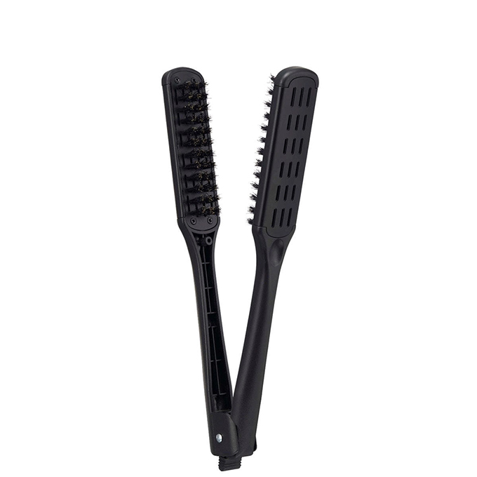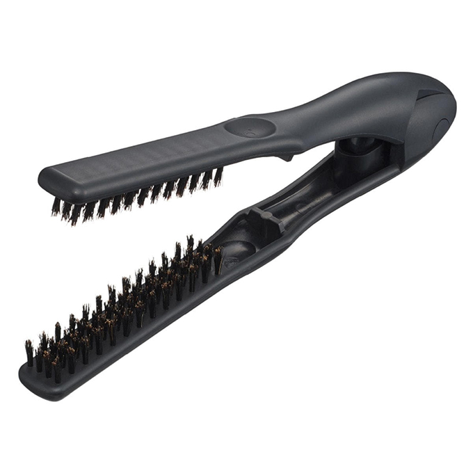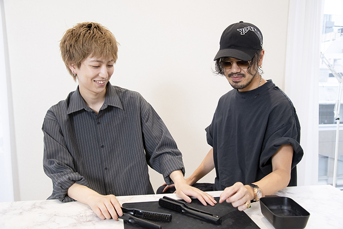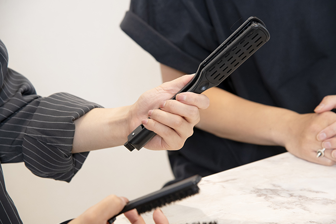 ゆうだい:まずは愛用しているツインブラシから紹介します。サロンワークでは太さ違いで2タイプ使用しています。幅が狭いデンマンの方は、ショートからセミロング用として大活躍。細かい部分にまで対応してくれますし、メンズヘアのアイロンワークでも、小回りが効きます。