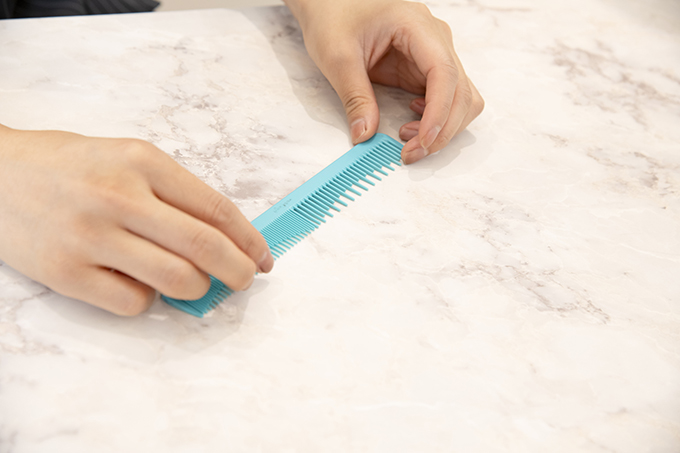 密歯だけのコームは梳かしにくさを感じる時がありますが、こちらは入口が粗歯なのでスピーディーにパネルが取れるし、毛束も掴んでくれる。縦スライスでも毛が落ちずにコームスルーできるので、今どきのレイヤースタイルのカットに最適。