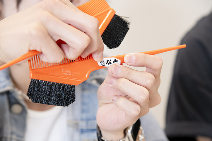 星那:こちらの刷毛は毛量も多くて、しっかりと剤をキャッチしてくれるので、施術がスピーディー。持ちやすく、圧もコントロールしやすいので、長時間の施術も疲れにくいんです。ちなみにこのモデルは7色のカラーバリエーションがあるのですが、オレンジは星那専用で使っています。
