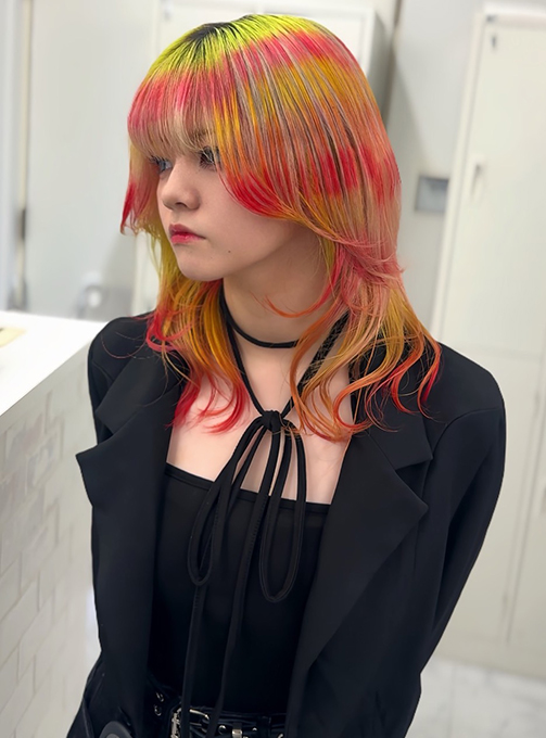 夕凪の海と西瓜の色の相性が好きなので、この作品では青味を使わないヘアカラーで表現しました。ホットな夏のムードの色味をデザインカラーに落とし込みつつ、スタイリングではラフな動きをプラスし、躍動感を演出しています。