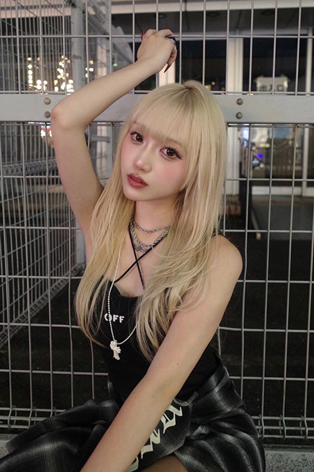 トレンドのレイヤーカットスタイルを外ロケ+デジカメ質感を合わせ撮影。モデルさんの端正な顔立ちを生かして、モノトーンな衣装とブロンドヘアを組み合わせています。ロケーションは自転車置き場です。ポージングに動きを出すことで、モデルの存在感を強調しています。またレイヤースタイルを際立たせたのがポイントです。
