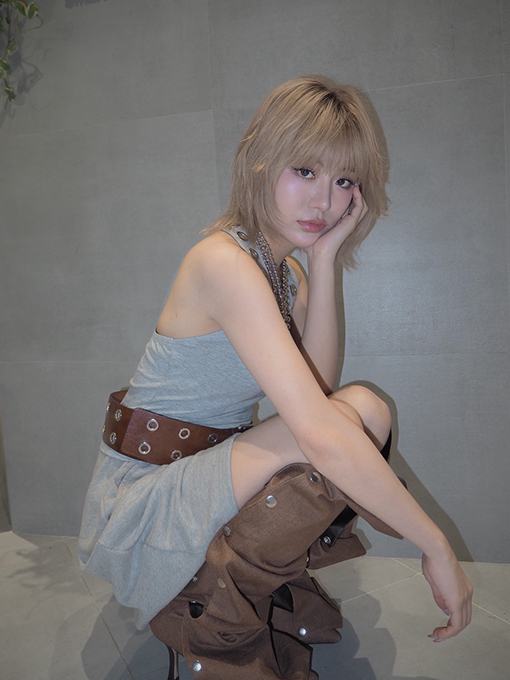 柔らかいミルクティーカラーに合わせて、衣装もグレーとブラウンで全体的に透明感や柔らかさが伝わるコーデに。アクセサリーや靴に個性的なアイテムを配置して、芯の強さを表現しました。トレンドに合わせた衣装とヘアとのバランスに注目して欲しいです。