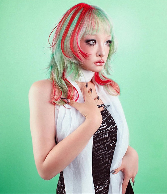 「MAKE IT GLOW」のテーマに合わせ、光を含んだようなカラーを表現しました。顔まわりにはレイヤーカット。そしてポイントカラーとして、レッドとグリーンを入れ、モデルの個性と存在感がより鮮明に際立つようデザインしました。