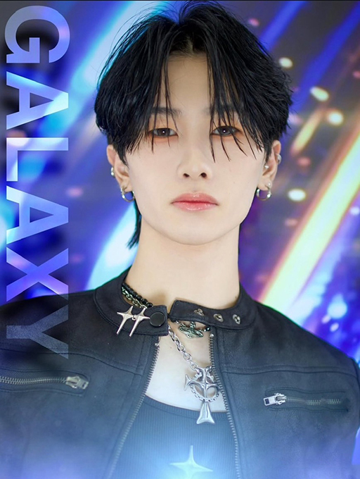 キラキラ輝くGALAXYをイメージして作品を作りました! ヘアのこだわりは、黒目を挟むようにこぼれ毛を下ろしているところです。衣装では首周りに星が付いているようなジャケットで世界観に合わせました。