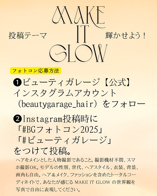ヘアをメインとした人物撮影であること。撮影機材不問、スマホ撮影OK。モデルの性別、世代、ヘアスタイル、衣装、背景、画角も自由。ヘア&メイク、ファッションを含めたトータルコーディネイトで、あなたが感じる MAKE IT GLOW の世界観を写真で自由に表現してください。