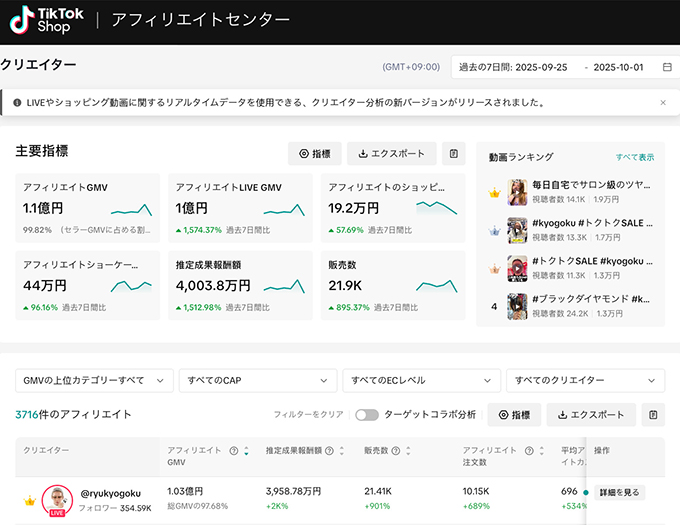アフェリエイトGMVは1.1億円。アフェリエイトLIVE GMVは1億円。ちなみにこちらは過去7日間のデータだそう