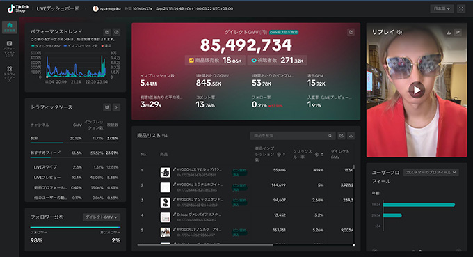 おかげさまで、TikTok Shop 公式イベントでは過去3回連続で累計1億1,000万円を売り、日本一になりました。そして、9月の月間売上は2億円を突破しました。今後の目標としては、1回のライブで3億円の売上を目指しています。
