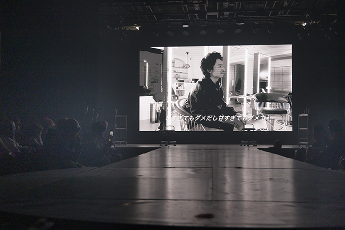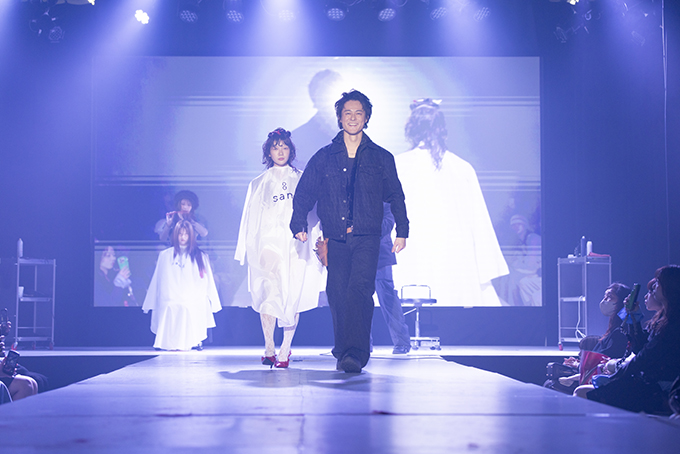 3番目に登場したのは、sand。冒頭はシネマのような映像演出からスタート。今回のテーマ「food=風土」がスクリーンに映し出されました。出演したのは、大阪を拠点に活動するへぎしょうたさんと、ベルエポック美容専門学校卒業生で現在はsand銀座店に所属する白鳥結花(しらとりゆいか)さん。