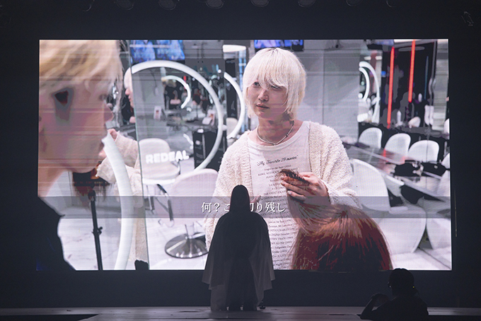 NEXT LEVELのトリを務めたのはREDEALでした。今回のヘアショーの発起人でもあるはんぺんさん(中村雄樹)と、若手代表としてばななさんが出演。スクリーンには、REDEALを舞台にしたショートドラマが映し出され、物語と連動するようにステージが進行していきます。