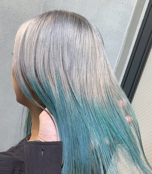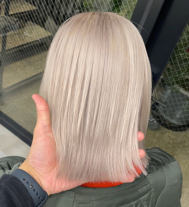 13ダスティグレーは、深みのあるグレーで、自然に青みが出てくれます。2剤が2倍なのでコスパもいいし、青みが若干入っているので、オレンジイエローっぽいアンダーでも打ち消してくれます。キレイなシルバーに仕上がります。