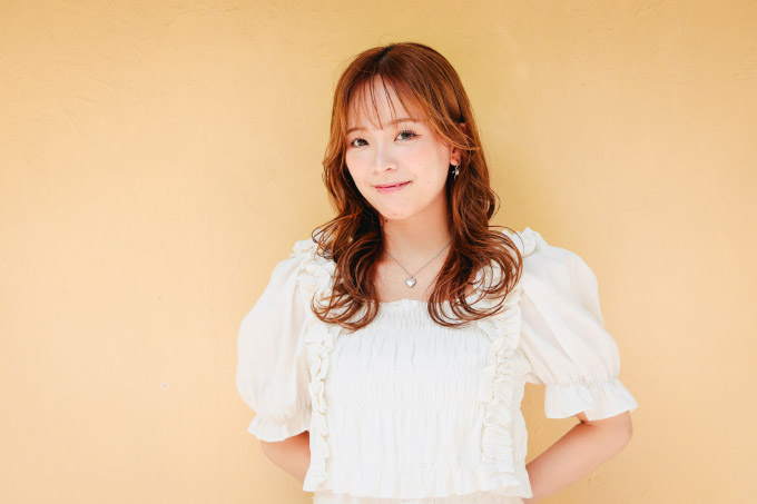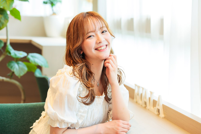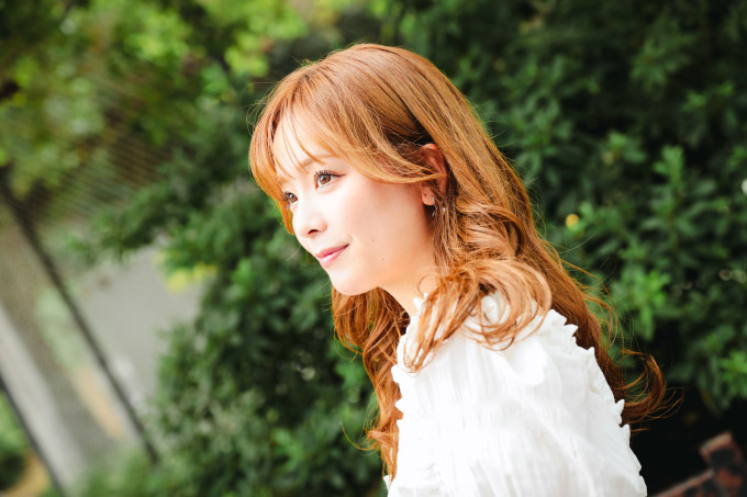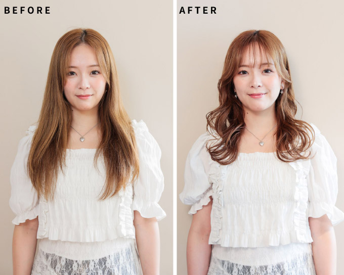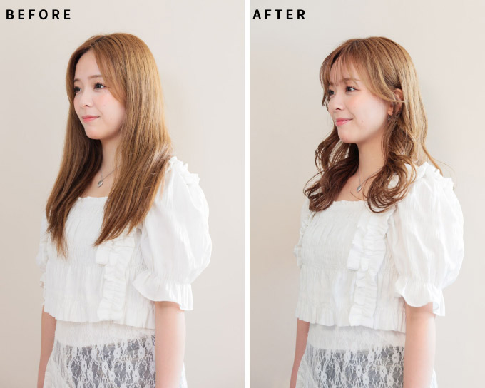 念願の前髪ができたことで、かわいらしくも華やかな雰囲気に。岡嵜さんが持つオーラがより輝きを放っています。ふわふわフェミニンなアイドルのような仕上がり!