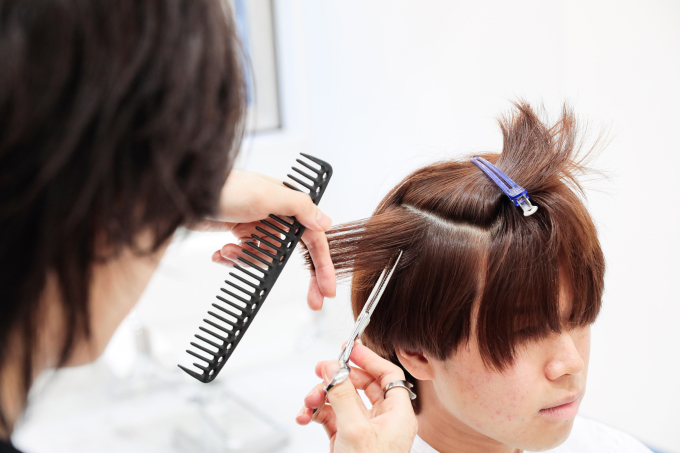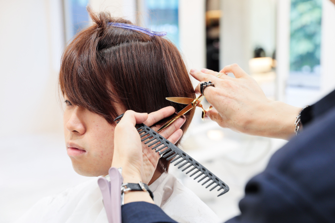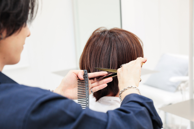 耳周りはスッキリさせたいものの短すぎると顔のエラが強調されてしまうため、少し前下がりにカット。野暮ったさをなくしつつ、骨格に合わせて小顔に見える長さに設定します。