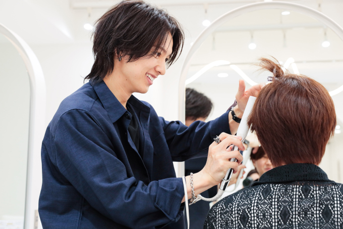 セットはアイロンでパーマ風に。波を入れて動きを出すことで、スタイリストらしいかっこよさと、翼らしいかわいさを同時に表現します。スタイリングは、ライトハードタイプで動きを出しやすいワックスを使います。