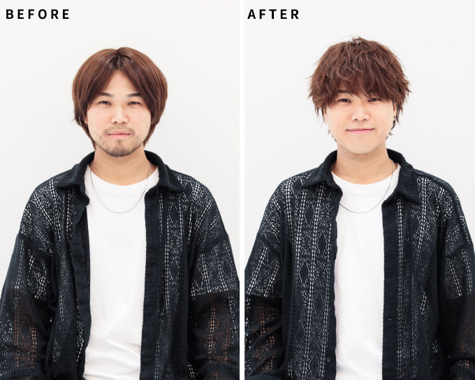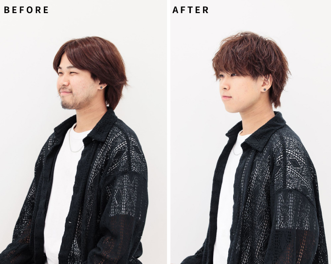 名付けて「シースルーラウンド波打ちマッシュ」の完成です。クールな表情のときはかっこよく、笑顔のときはかわいく……という表情によって変化を感じることができるスタイルに変身しました。ヒゲも剃って、清潔感も◎。