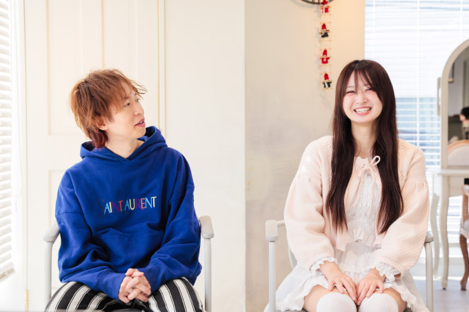 結菜:きっと毎日刺激的で楽しいからヤル気が続いているんだと思います。自分と同じようにアイドル好きなお客さまがたくさんいらっしゃるので、サロンワークを通じて交流するのがすっごく楽しいんです。前職のサロンで一通りの技術は習得したつもりでいたのですが、cache cacheの技術はひと味もふた味も違って。洗練された技術を学ぶことができる環境にも感謝しています。