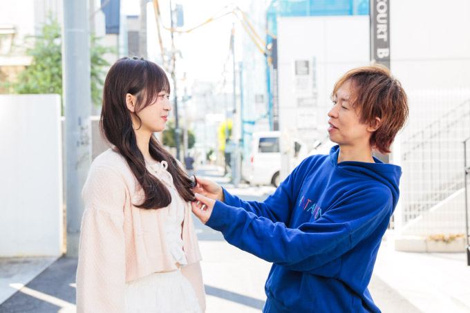 結菜:(にっこりと微笑みながらうなずく)。最高です! ありがとうございます! 手触りもぜんぜん違います。憧れている渉さんにカットしてもらえるのは、当たり前のことではないので、本当にうれしいです。