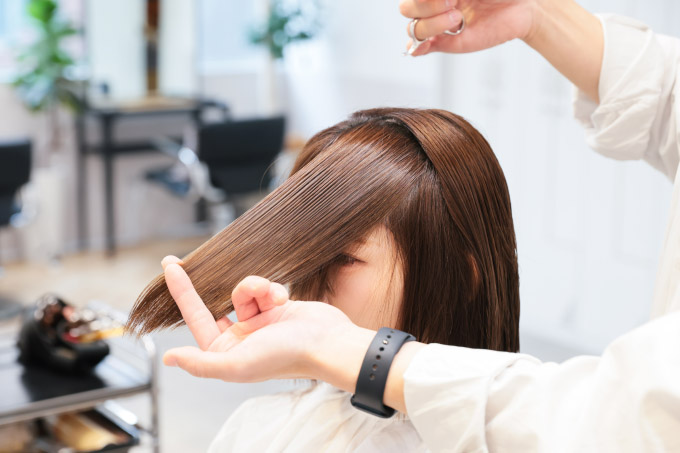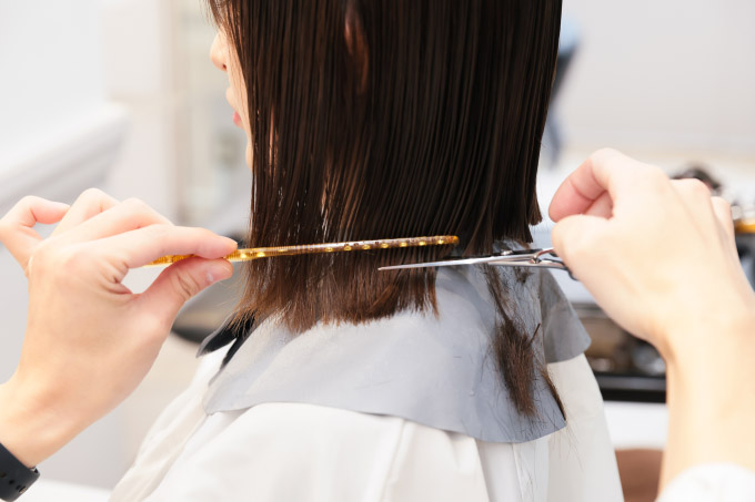 溜まりやすい耳後ろをメインに毛量調整します。七海は、耳の後ろから襟足にかけてのラインがキュッと締まっているので、そこまで大量に梳かなくてもOK。逆に、耳の後ろが張り出している人は、しっかり量を取っておかないと耳にかけた時の収まりが悪くなってしまいます。