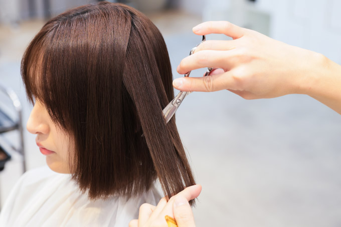 顔周りをカットします。七海の場合、どちらかというと求心的な顔立ちなので、中途半端な長さにせず、短いか長いかの2択。今回は顎下のボブにしたいので、短い方を選択します。ボブのカットでは、まず前下がり気味に設定することが多いです。バック毛量の方が多いので、前下がりにしておくことで、結果的にカットラインが持ち上がり、シルエットがまっすぐ見えるからです。