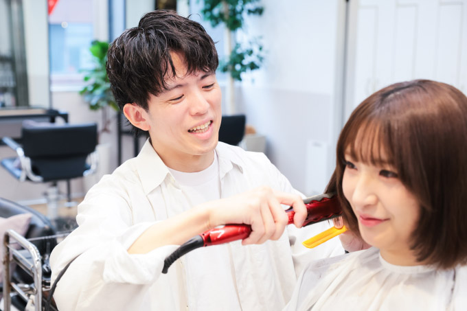 次にスタイリングです。レイヤー部分のみ少し丸字をつけ、他はストレートに。GRAFFオリジナルのオイルとワックスを混ぜて、艶を出しつつスタイルキープす。オイルだけだとまとまりは出るもののキープ力が弱いので、ワックスをプラス。髪質にもよりますが、レングスが短いほどワックスを多めにすると、スタイリングがしやすくなります。