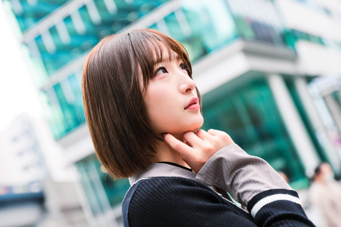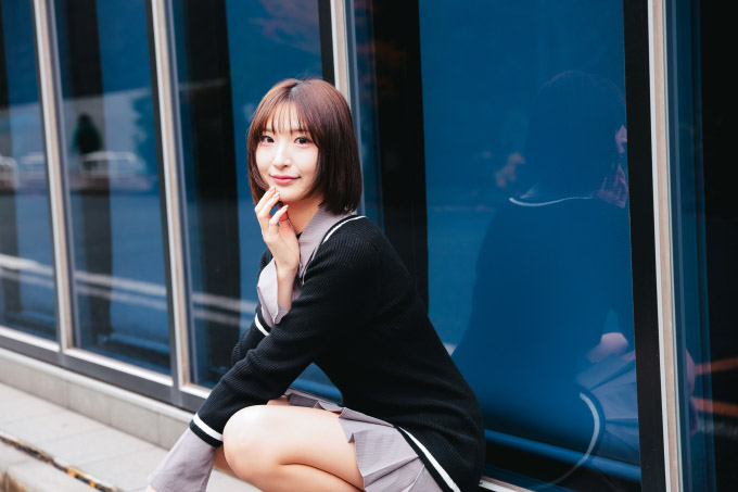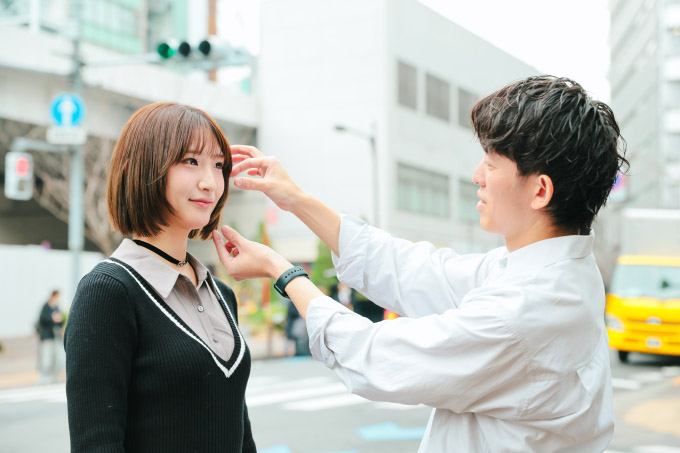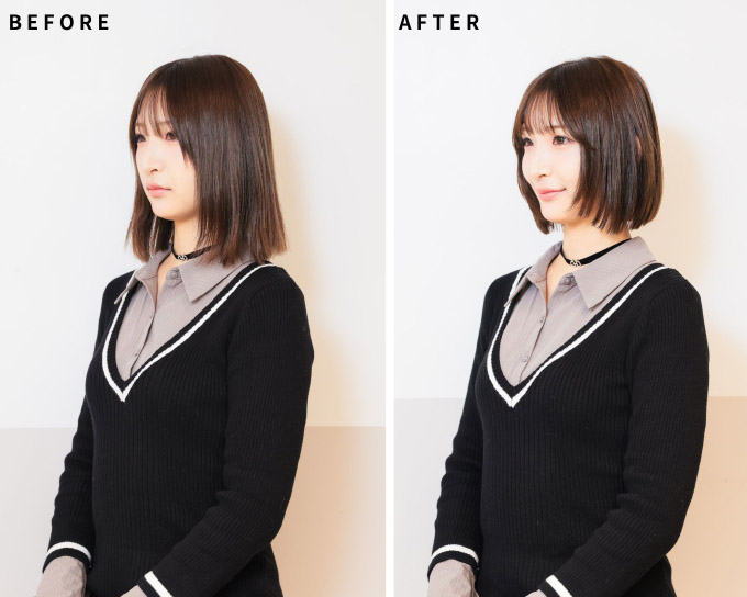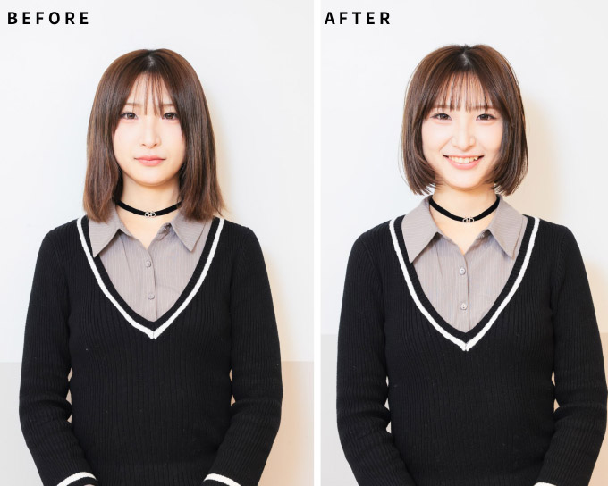 ライン感を効かせた、クールなボブスタイルが完成。シャープなフォルムに、七海さんの笑顔が重なることで、ほどよい“かわいさ”も感じさせます。七海さんの持つ多面的な魅力を、自然に引き出すスタイルに仕上がりました。