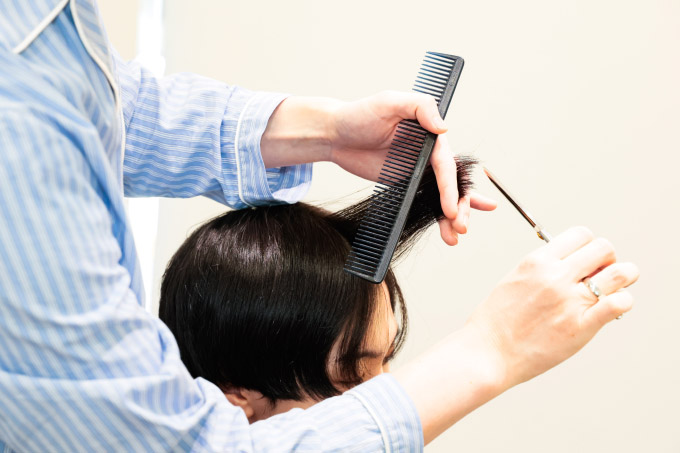 仕上がりを正確に確認したいので、今回はドライカットで切ります。トップの長さ設定と量感を決めます。「ハチが張りやすい」と本人の悩みにもありましたが、トップの骨格が凹み気味なので、その影響でハチ周りの髪が膨らみやすくなるという要因も。なので、トップが立ち上がりやすくなる長さと量感をベースに作っていきます。耳の上は短くしすぎないところもポイントです。