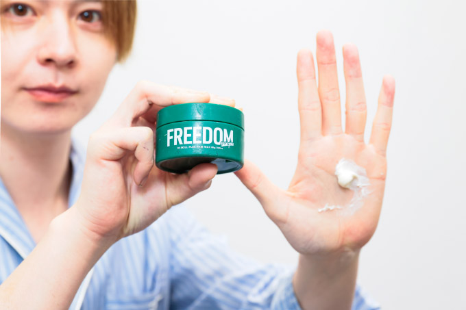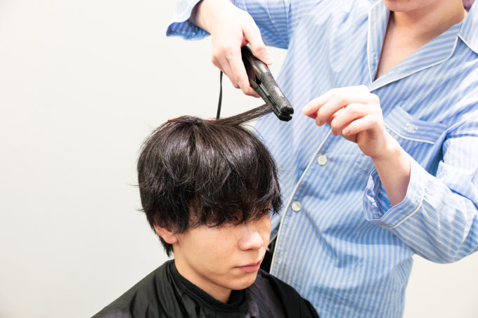 カットが終わったら、次はスタイリング。細めのアイロンで仕上げます。颯太はベビーフェイスなので幼くなりすぎないよう、毛先をシャープにするイメージでアイロンを通していきます。スタイリング剤はSKILLのワックスを使用。根元、中間、毛先にしっかり均等になじませることがポイントです。