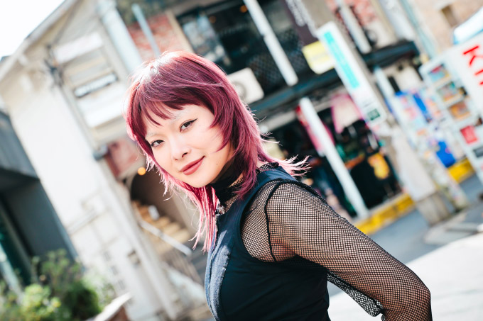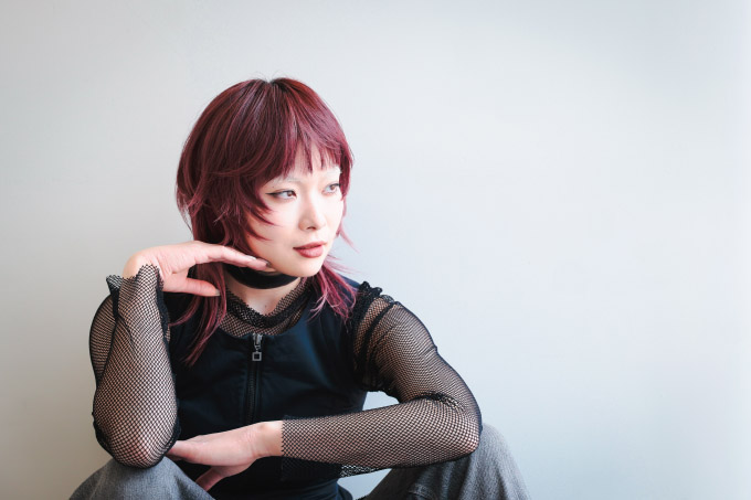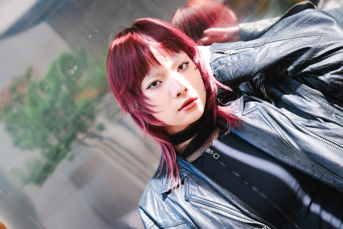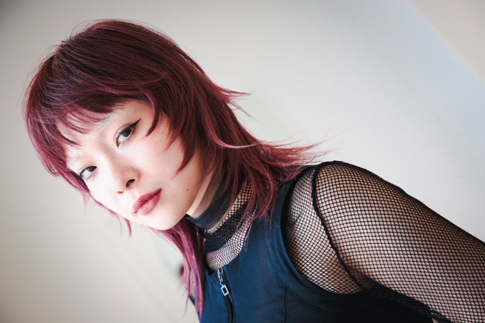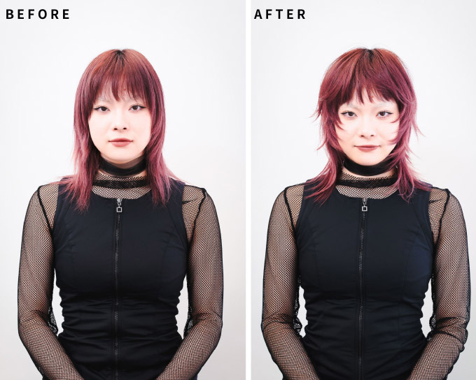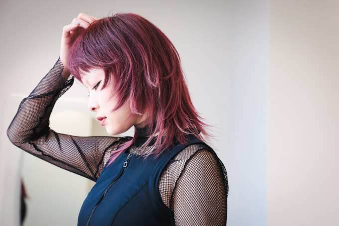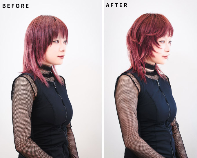 短く入れたレイヤーがデザイン性を発揮するハッシュカットの完成です! ワインレッドのカラーとブリーチに、存在感を消した眉も相まってモードでかっこいい女性に変身しました。