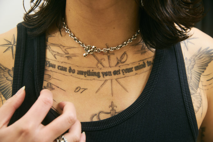 胸のタトゥーは、小学生の頃から大好きで影響を受けたエミネム の楽曲Lose Yourselfの「You can do anything you set your mind to man(心に決めたことはなんでもできる)」という歌詞。