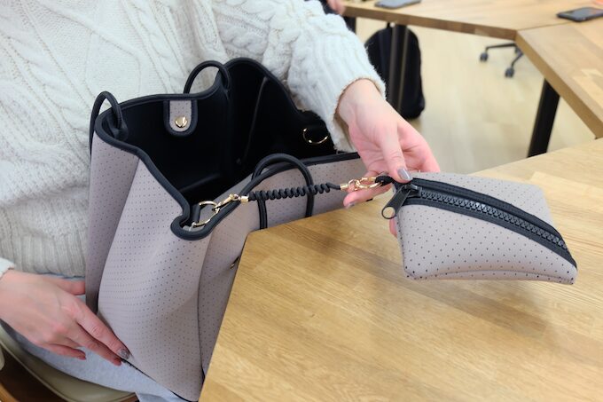 美山:まず、素材はガシガシ使ってもらえるように、タフで軽いネオプレンを選択しました。2色展開なんですが、美容師だからこそ色にはこだわってます!特にグレージュはオススメで、モカが少し入った柔らかめの色味で、男女どちらが持っていても違和感がない仕上がりになっていると思います。