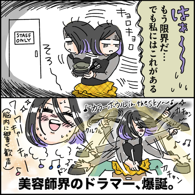 音楽って、本当にすごい。叩けば叩くほど、心が軽くなって笑顔になれる。今日も私は美容師界のドラマーとして、カラーボウル片手にリズムを刻みます!