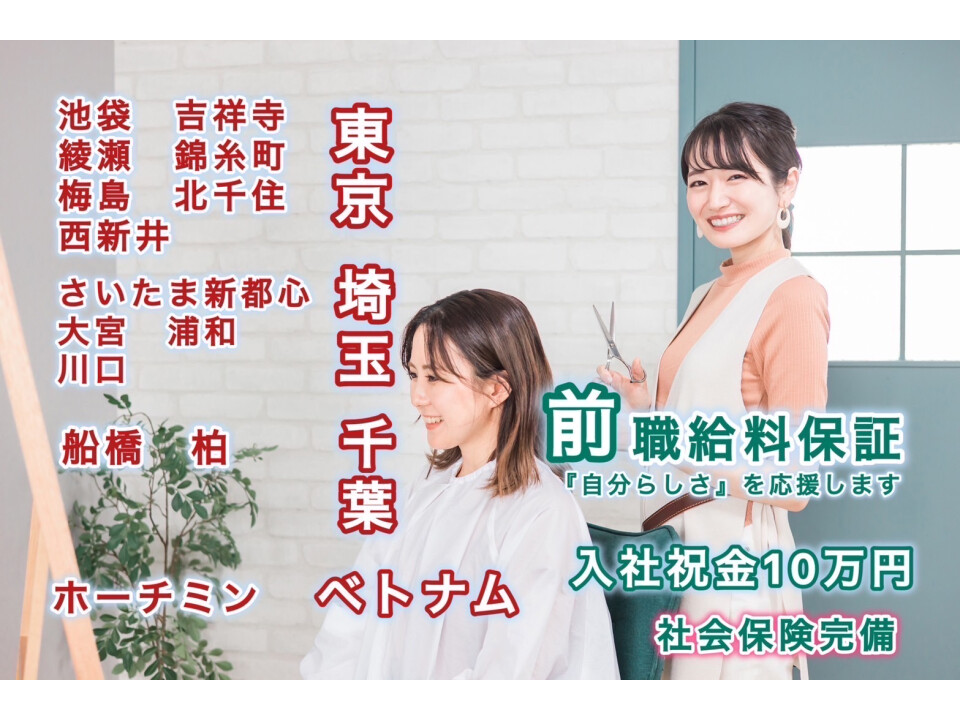 ✨OPEN情報✨ 2025年6月24日・北綾瀬 2025年7月24日・表参道 北綾瀬⇒北綾瀬駅直通の新施設ララテラス内! 表参道⇒B2出口から徒歩5分の好立地♪ ✨同時募集中✨ ⇒柏・船橋・市川 ✅教育について デビューまで充実のサポート体制でバックアップします! ・自社アカデミーあり ⇒最短1年半デビュー可能! ・メンター制度 ⇒歳の近い先輩がメンターとしてついてくれる! ・動画で学べるアプリ学習 ⇒復習や個人練習に役立つ! ・営業時間内練習OK ⇒自分のペースでデビューまで進めます♪ ・技術合格したら入客 ⇒実践を大事にしています。 ※対応や技術に関しては、バックアップを丁寧にするので安心してくださいね。 ✅待遇 ・月23万~25万(月給)+各種手当 ※店舗とお休みによって変動。 ・社会保険完備 ・有給は定期的に消化 ・引越準備金10万円支給 ・ヘッドスパ指名で歩合10%バック♪ ✅お休み ・完全週休2日制 ・土日休みOK ⇒実際に、必ず月1は土日休みにしている方や、 3連休を取得する方もいます♪ ✅デビュー後 デビュー1年で【月収30万円】を稼ぐ先輩スタッフが多数います。 技術と自分に自信を持ってデビューできる環境なので、スタイリストになってからも着実に稼げます。 ✨サロンコンセプト✨ 客数重視のスタイルではなく、お客様一人一人と丁寧に向き合います。 楽しく、無理なく、やりがいをもって、 『稼げる美容師』『人気美容師』になれる環境です。 働き方改革にも積極的に取り組んでいます! 待遇面・休日面・福利厚生面など、 『より働きやすい環境はないか?』を常に追い求め、 これからもスタッフの声を実現していきます。